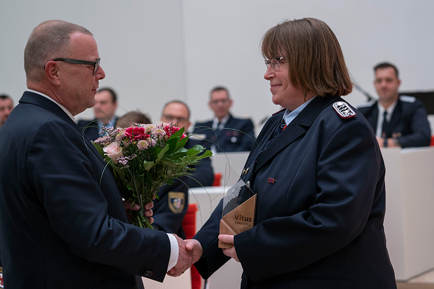 Rund 150 Kameradinnen und Kameraden der Feuerwehr und des Technischen Hilfswerks waren der Einladung der CDU-Fraktion in den Landtag Brandenburg gefolgt. Der Blaulichtpreis „Vitus“, dessen Name einer Heiligenlegende aus der Antike entlehnt ist, wurde in diesem Jahr erstmals vergeben.