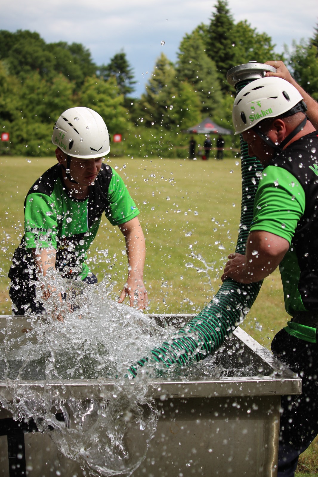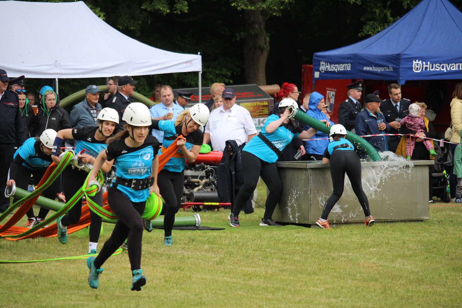 In der Wertung mit DIN-Pumpe gewannen bei den Frauen ebenfalls die Gehrener Damen (LDS) in 26,28 s vor Kittlitz (OSL) mit 28,45 s und Schlepzig (LDS) mit 28,79 s. Bei den Männern gelang den (Mit-)Gastgebern aus Zerkwitz (OSL) der Heimsieg in 22,08 s vor Genschmar (MOL) mit 22,36 s und Neschholz (PM) mit 22,61 s.