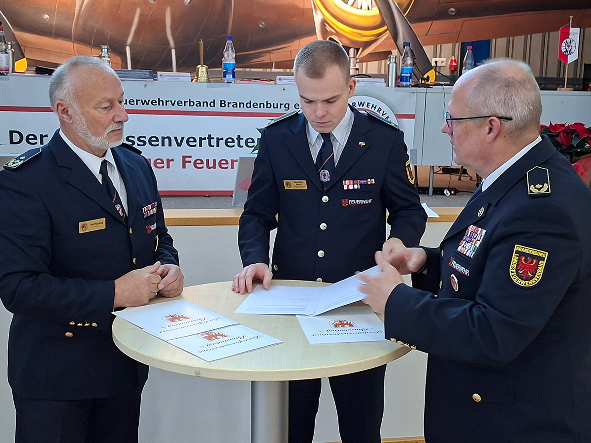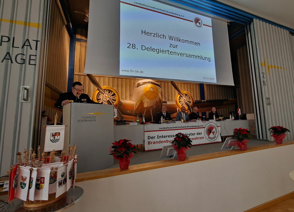Die Delegierten der Kreis- und Stadtfeuerwehrverbände des Landes Brandenburg trafen sich Mitte November zu ihrer 28. Delegiertenversammlung des Landesfeuerwehrverandes. Die Veranstaltung auf dem Flugplatz Schönhagen in Trebbin war gleichzeitig eine Wahlveranstaltung. Zur Wahl stellten sich Rolf Fünning als Präsident des LFV sowie Frank Kliem als Vizepräsident.