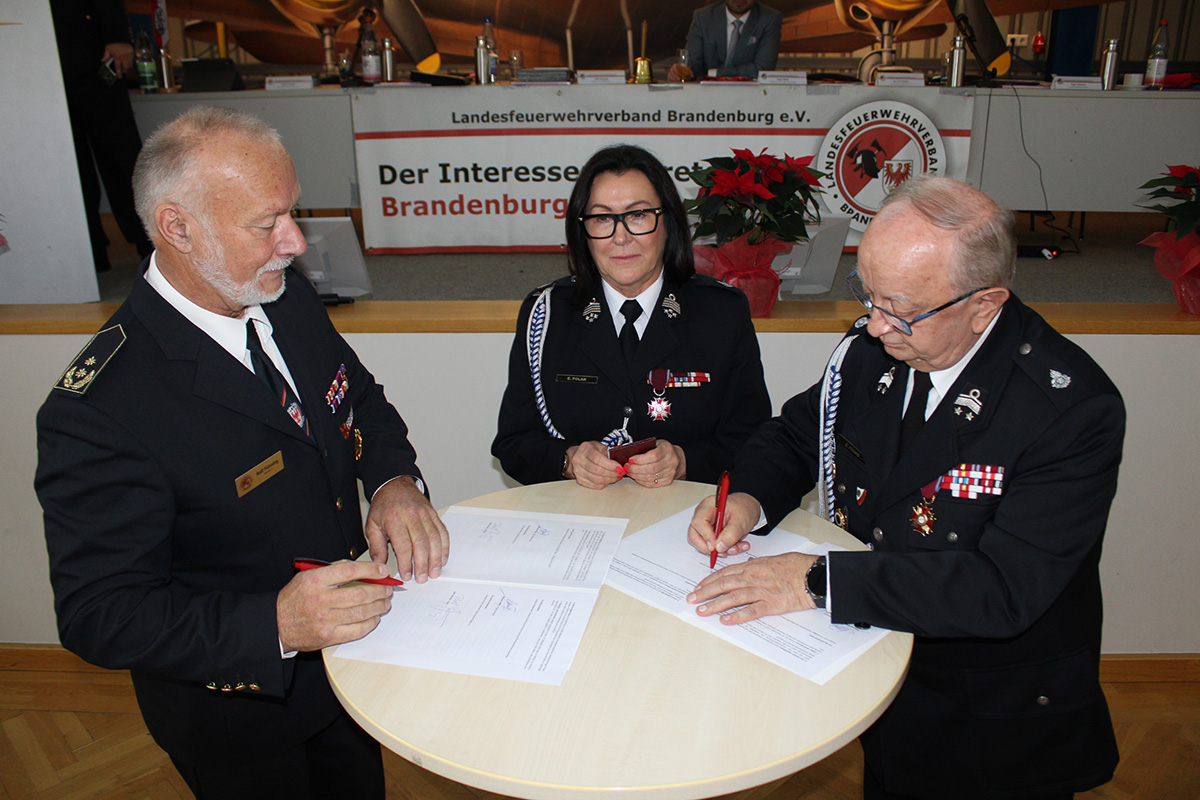 Die Delegation des Lebuser Wojewodschaftsvorstands des Freiwilligen Feuerwehrverbandes der Republik Polen und der Landesfeuerwehrverband erneuerten mit der Unterzeichnung des Vertrages zur grenzüberschreitenden Zusammenarbeit ihren Willen sich auch weiterhin für die Kameradinnen und Kameraden der beiden Länder stark machen zu wollen.